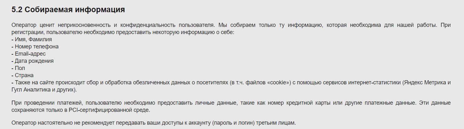 В разделе Собираемая информация администрация сайта Спин Вин указывает, какие личные данные необходимо подать клиентам, чтобы они могли осуществить вывод денег.