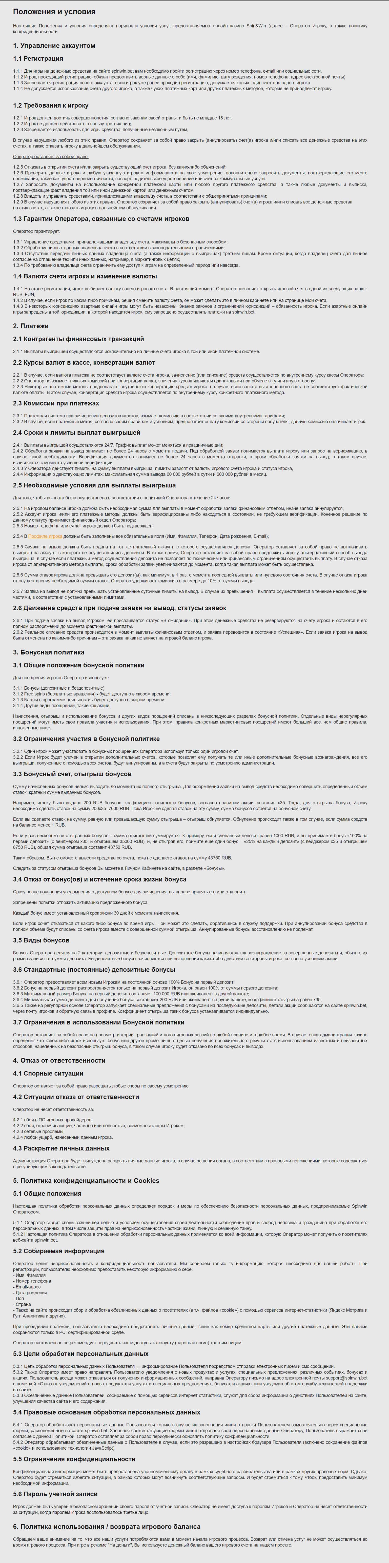 Ниже вы можете ознакомиться с полным текстом договора с клиентов онлайнового казино Спин Вин.