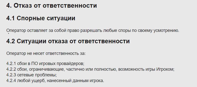 В разделе под названием Отказ об ответственности казино говорит о том, что не несет ответственность за любой ущерб клиентов, сбои в работе оборудования и тому подобное.