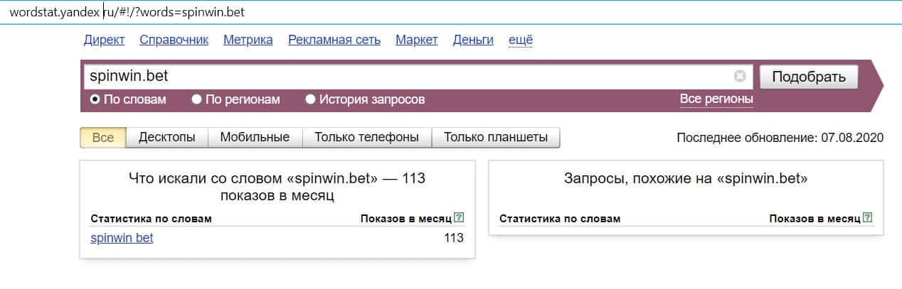 Количество запросов по домену "spinwin.bet" с точкой, совершенных в сервисе Яндекс, равняется 113 показам. Не сказать, что очень много для такого типа заведения.