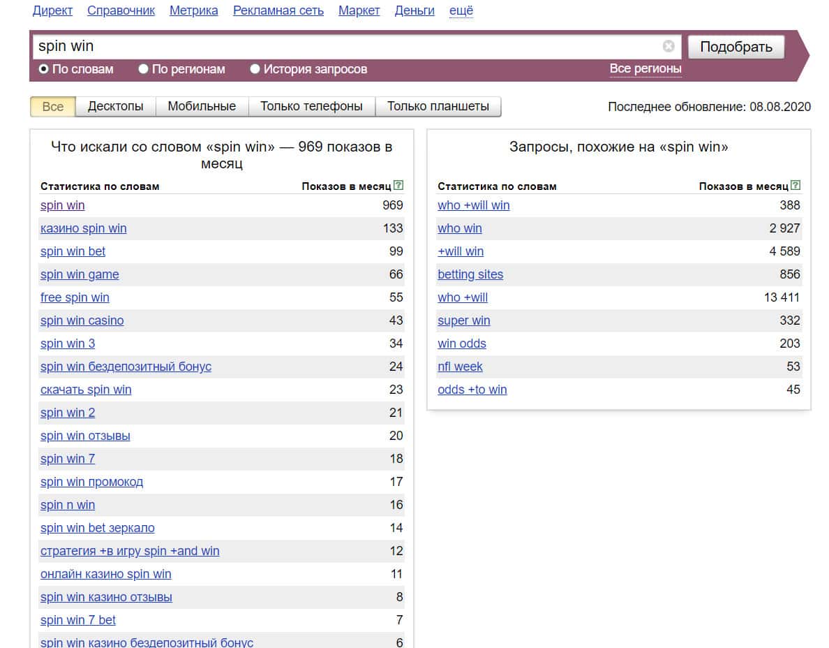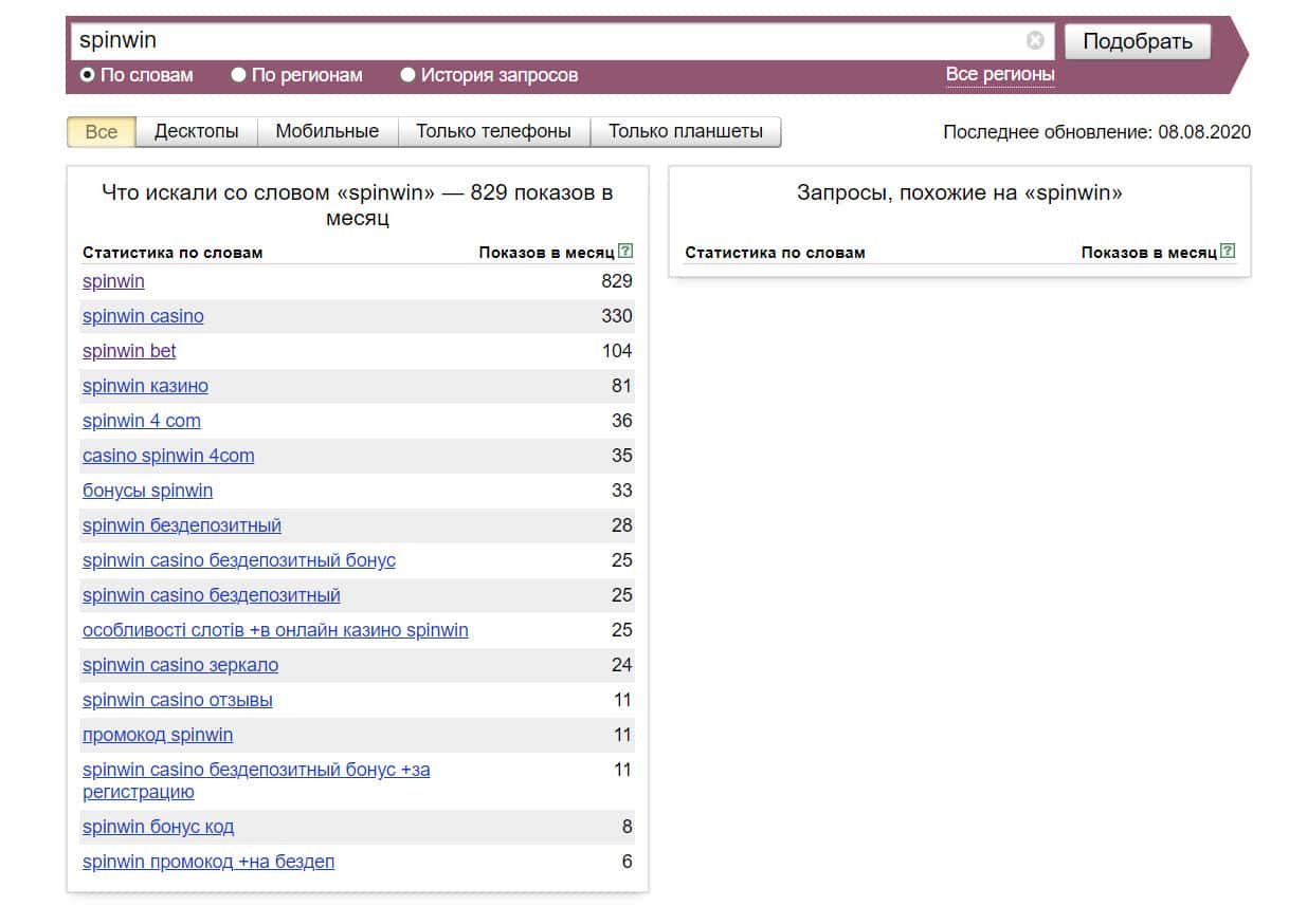 Количество запросов по бренду "Spin Win" на английском языке с пробелом также не очень большое. Его набирали в поисковике Яндекс 969 раз.