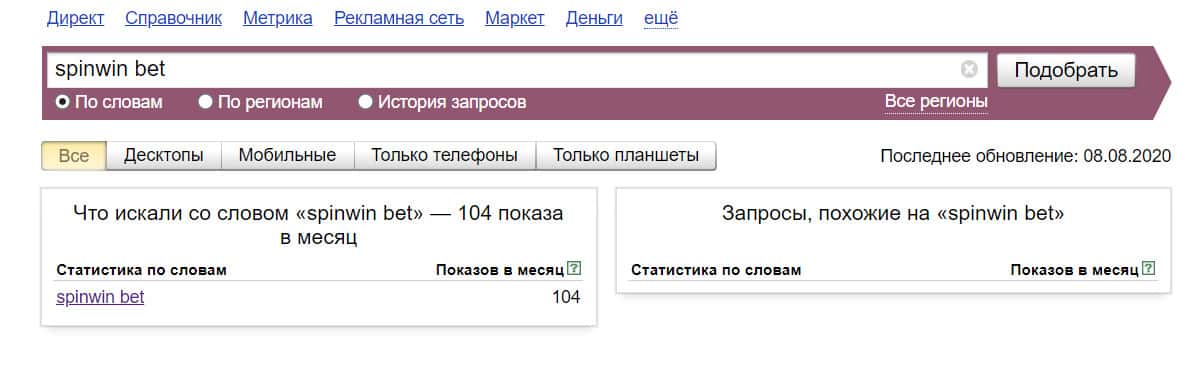 Количество запросов по доменному имени "spinwin bet", написанного с пробелом, по данным сервиса Яндекс Вордстат, равно почти такой же цифре - 104 показа.