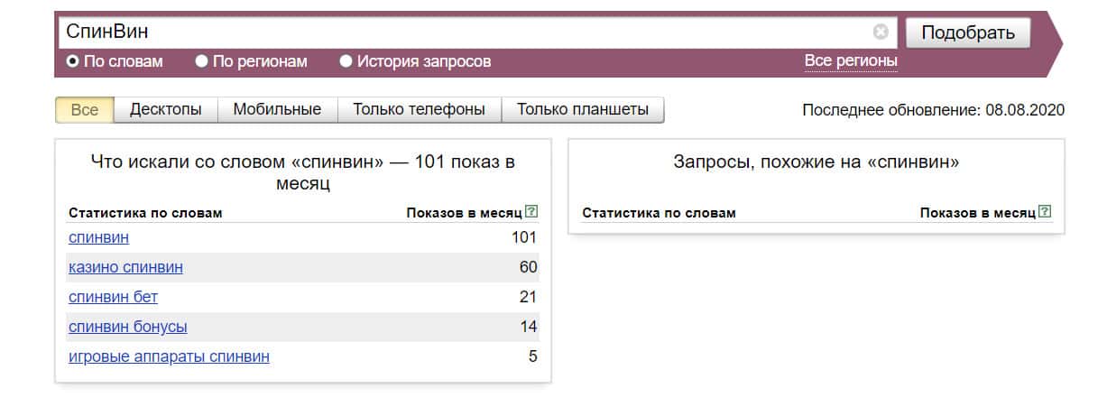 Название бренда "СпинВин" на русском языке без пробела пользователи почти не искали в системе Яндекс, результат равен 101 показу.
