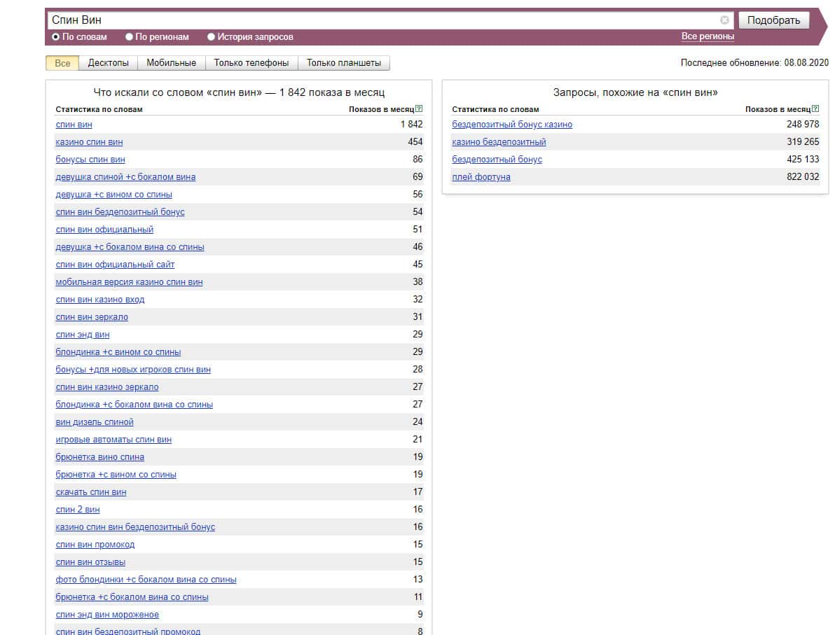 Название бренда "СпинВин" на русском языке без пробела пользователи искали в системе Гугл, не очень активно.