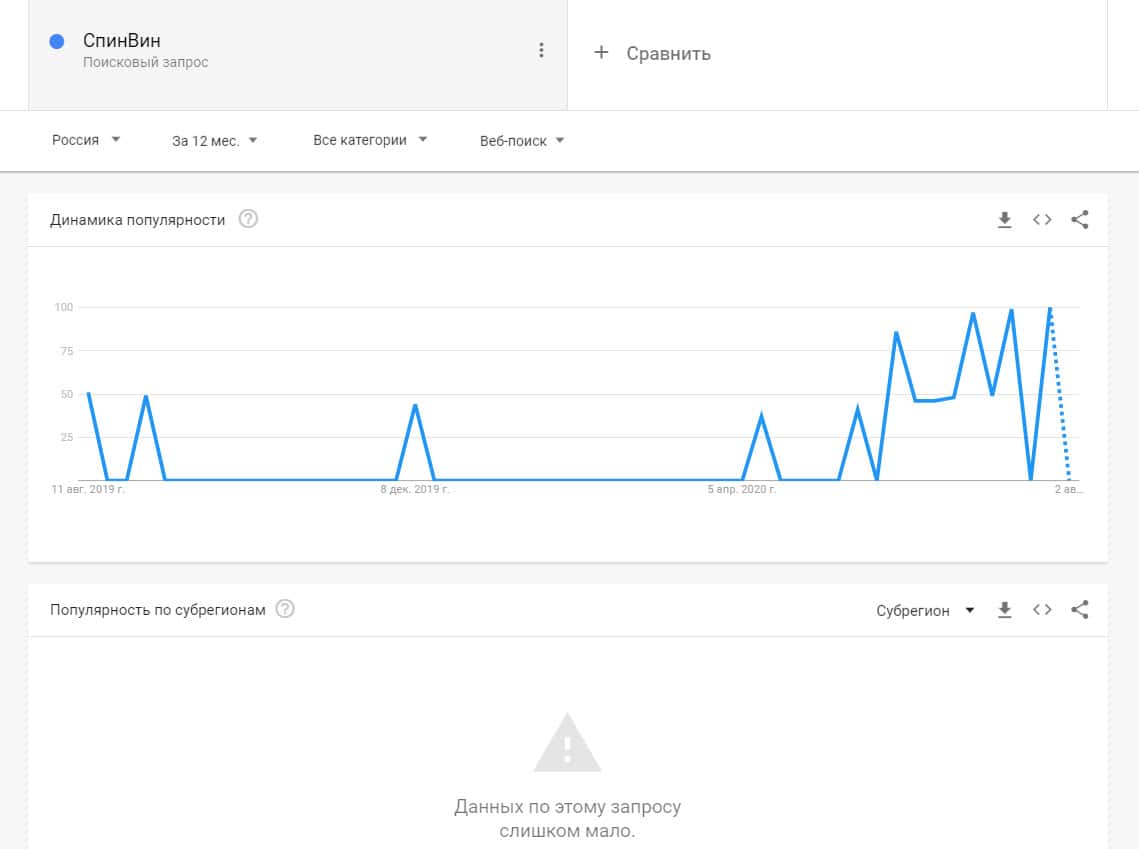Название бренда "Спин Вин" на русском языке искали в системе Гугл мало пользователей.