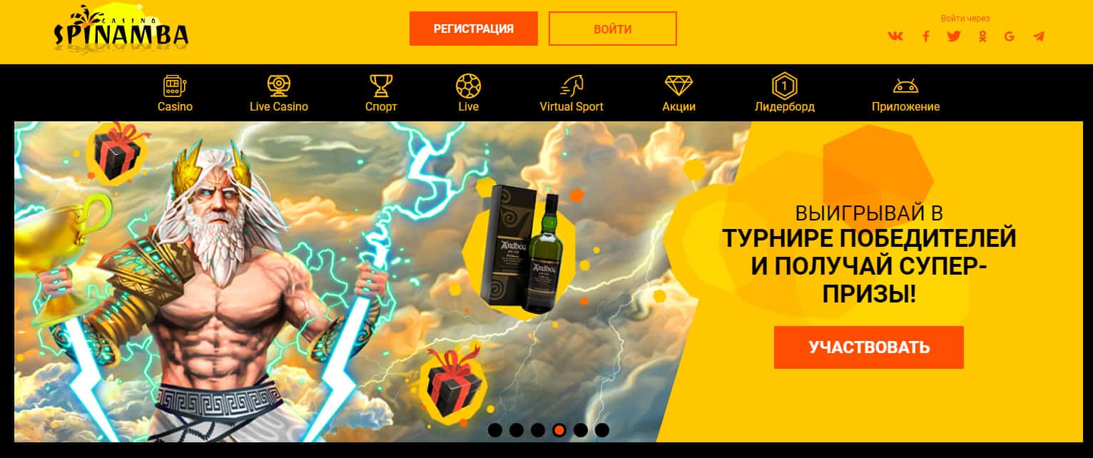 Начинается сайт у проходимцев Спинамба с довольно стандартной и ожидаемой шапки сайта-казино, в которой аферисты Spinamba предлагают наивным посетителям регистрацию на своем подвальном мошенническом сайте для дальнейшего слива средств. На изображении, расположенном ниже, вы можете наглядно увидеть начало сайта мошенников Спинамба.