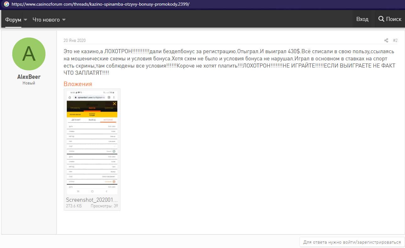 Негативный отзыв об аферистах Спинамба с веб-площадки casinozforum com