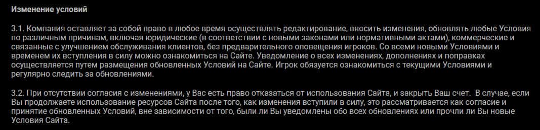 Далее в условиях сотрудничества у мошенников Спинамба следует довольно стандартная и ожидаемая информация о том, что аферисты Spinamba могут в любой момент по своему личному и персональному усмотрению изменить данные условия сотрудничества, о чем вы можете прочесть непосредственно на изображении, расположенном ниже.