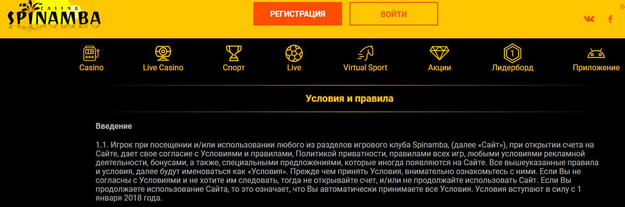 Условия сотрудничества у шулеров Spinamba начинаются со стандартной информации о том, что это за документ и зачем он нужен, в ходе которых мошенники Спинамба говорят информацию о том, что клиенты соглашаются с данным соглашением фактом регистрации. На изображении ниже вы можете увидеть начало условий жулья.