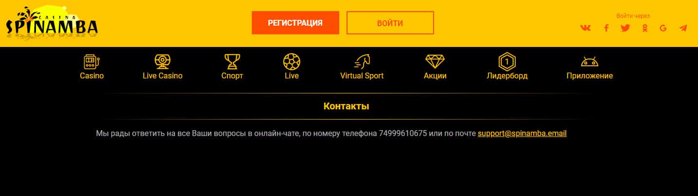 Под свои довольно сомнительные контакты аферисты Спинамба отвели отдельный раздел своего подвального сайта, где указали крайне мало данных о себе, что говорит о халтурности мошенников Spinamba, а так же их нежелании иметь дело с наивными пользователями сети интернет. Итак контакты аферистов, указанные на их мошенническом сайте: