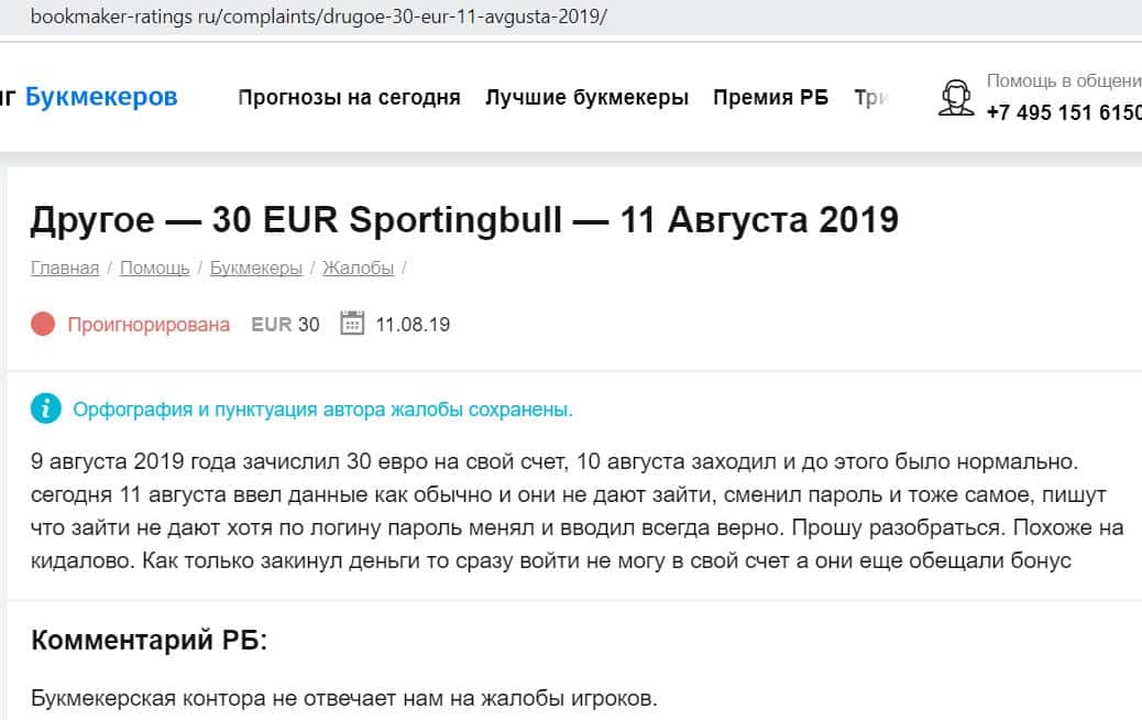 Другой пользователь пишет, что его кинули на сайте Спортинг Булл. Он не может зайти в свой аккаунт, похоже, там сменили пароль. Теперь все его деньги заберет букмекер.