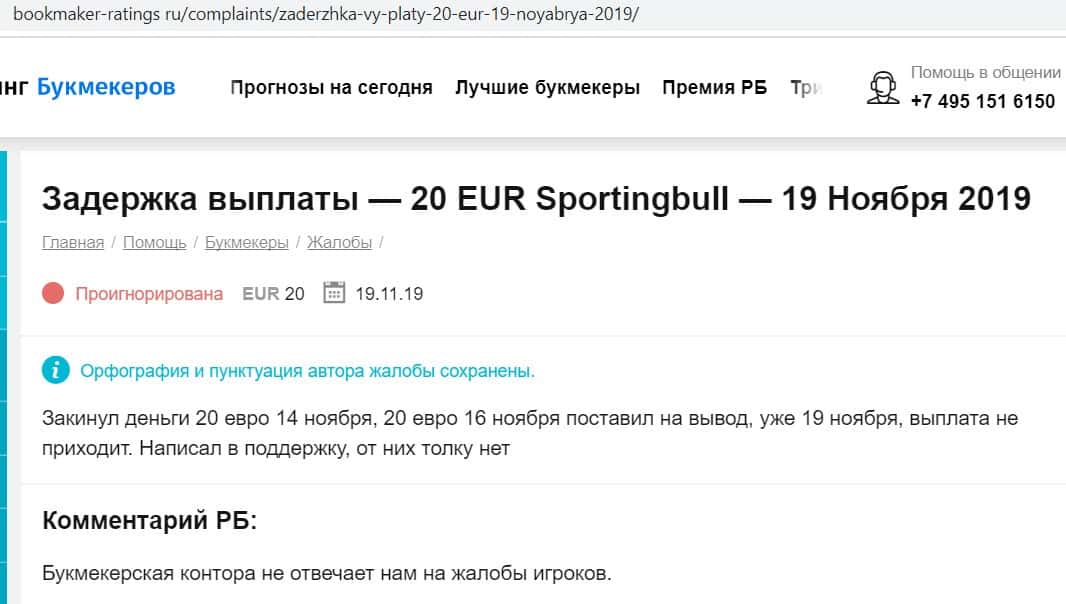 Мужчина написал жалобу на сайте Букмекеррейтингс на букмекера Спортинг Булл о том, что он задерживает выплату. неизвестно, придут деньги или нет, но игрок занервничал.