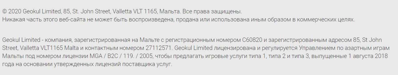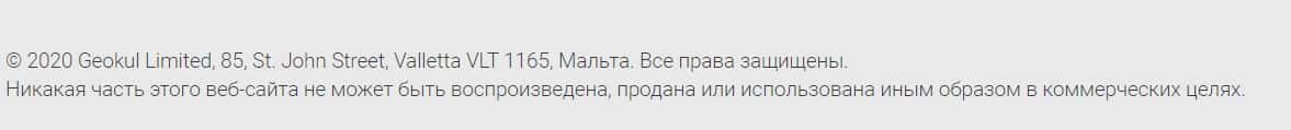 Юридическим лицом, представляющими контору SportingBull, является организация Geokul Limited. Об этом написано внизу главной страницы сайта букмекера.