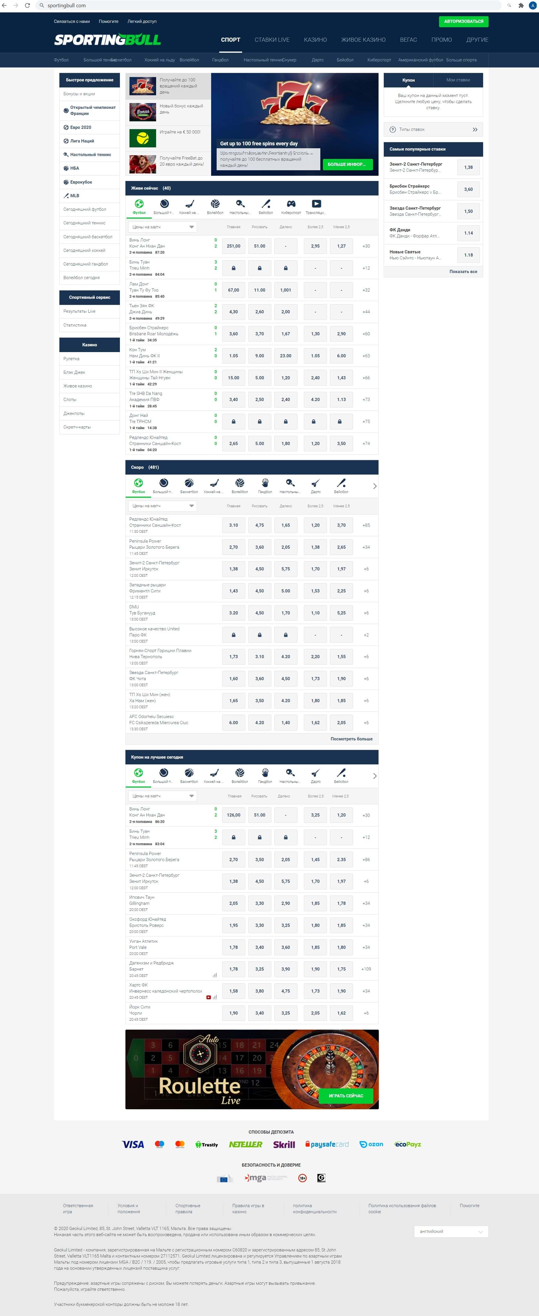 Главная страница сайта букмекерской конторы Спортинг Булл выглядит как все обычные сайты подобного типа. Ничего примечательного, стандартный сервис.