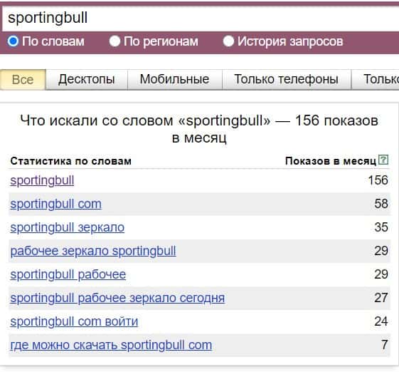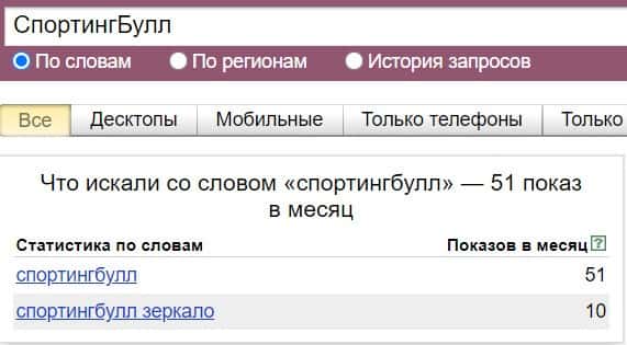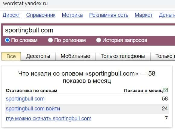 Количество запросов по домену "sportingbull.com" с точкой, совершенных в сервисе Яндекс, равняется 58 показам. Популярность букмекера у российских пользователей низкая.