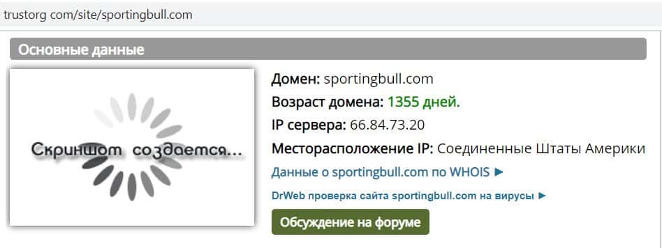 Возраст доменного имени сайта sportingbull com составляет 1355 дней. Букмекерская контора разводит клиентов на деньги уже длительное время.