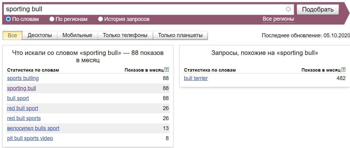 Название бренда "СпортингБулл" на русском языке без пробела люди искали в системе Яндекс не очень часто, результат равен 51 показу.