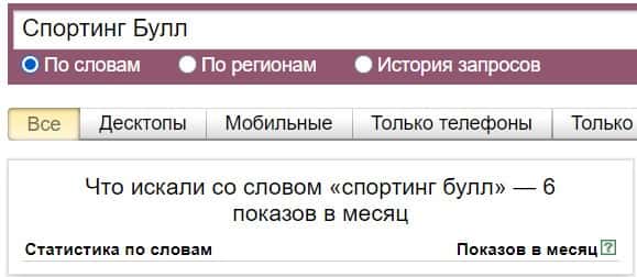 Название бренда "Спортинг Булл" на русском языке с пробелом люди искали в системе Яндекс всего 6 раз.