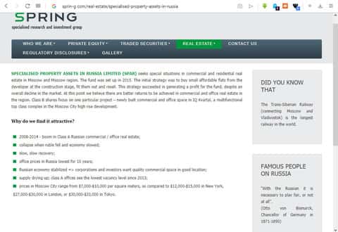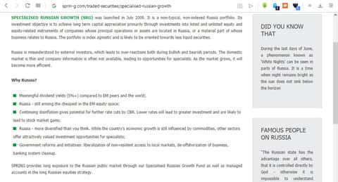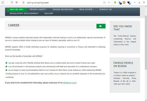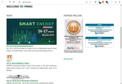 На главной странице конторы предоставляется блок информационного характера, связанного с деятельностью последней. В нём можно найти статьи о росте этого империалиста, который подобен кракену поедает все корабли, которые подплывают к нему. В них также Сприн-Г восхваляется тем, что является вторым по списку мировым лидером инвест-компаний, что ничем и нигде не фиксируется, конечно.
