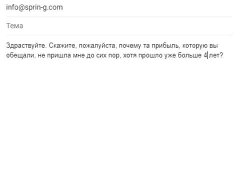 На сайте нам предлагают написать электронное письмо в центр поддержки, если у нас возникнут вопросы, связанные с работой, то есть с торговлей на платформе Сприн-Г. Пытаясь написать им, я сразу понял, что единственный способ с ними связаться - это всего-лишь замануха, они даже не отвечают на письмо своих клиентов. Я написал письмо и жду ответа на него уже более недели.