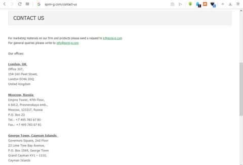 На сайте нам предлагают позвонить в центр поддержки, находящийся в трёх точках мира, если у нас возникнут вопросы, связанные с работой, то есть с инвестициями на платформе Сприн-Г. Пытаясь дозвониться в их главный офис в Лондоне, я решил, что единственный способ с ними связаться - это повестка из суда, которую они получат от кинутых клиентов. Сприн-Г - лохотрон-мошенник.