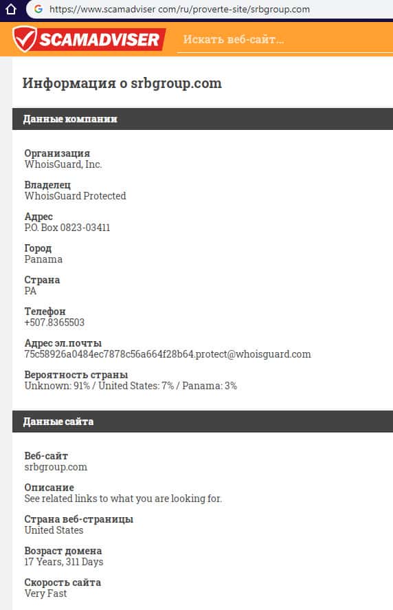 Техническую информацию о деятельности подвального сайта мошенников SRB Group, а именно возраст, страну регистрации и местоположение сервера сайта аферистов СРБ Груп, можно узнать непосредственно с помощью портала scamadviser com. На изображении, расположенном ниже, вы можете наглядно увидеть информацию о сайте шулеров SRB Group.