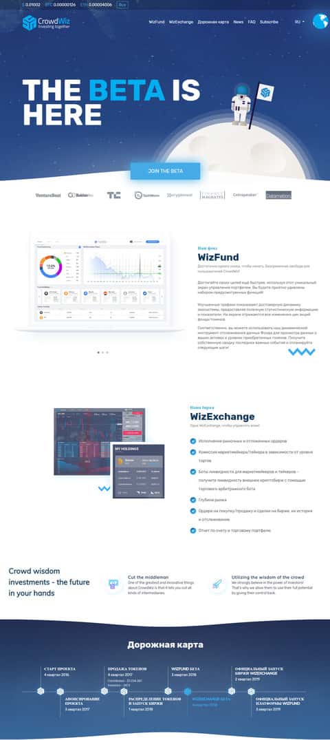 Весь сайт кухни Crowd Wiz мошенники разместили на одной странице, чтобы не тратить лишний раз и без этого скудный бюджет. А вот само наполнение сайта сделано в виде ICO-проекта по сбору денег с лохов. По итогу это даже не хайп, так как монеты купить может каждый, а вот продать нет.
