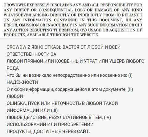 По договору конторы Сровд Виз можно четко сказать, что он лохотронский и ни в коем случае на него нельзя опираться, а тем более подписывать. Там четко сказано, что кухня Crowd Wiz явно отказывается от любой ответственности за прямой или косвенный убыток своего клиента.
