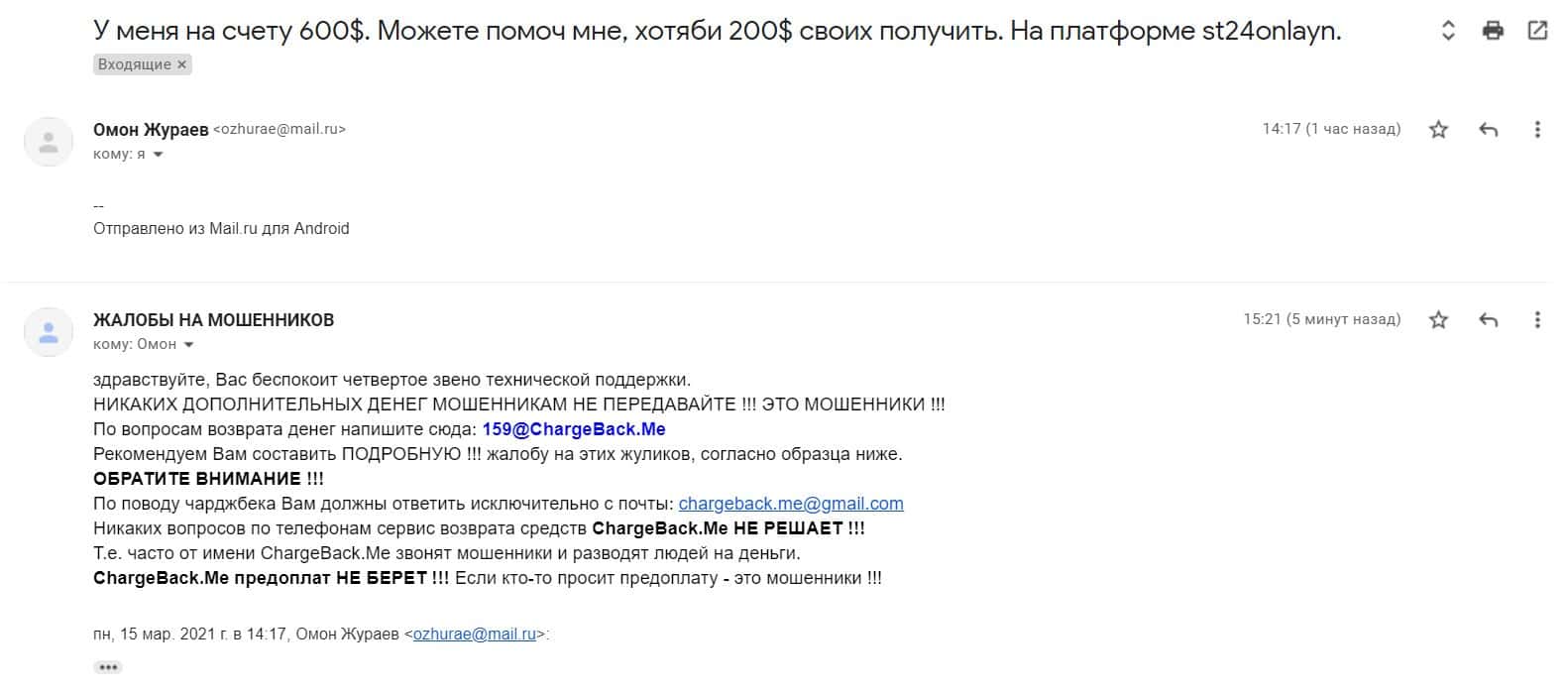 Насчет возможностей получить свои вложенные средства назад от МОШЕННИКОВ СТ24Онлайн - напишите сообщение на мыло: [email protected]
