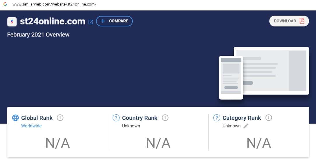 При проверке источников бренда по странам скам-организации СТ24Онлайн на сайте similarweb com, информация отсутствует, что является признаком Форекс-кухни.