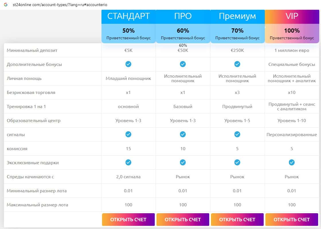 Мошенники ST24Online предлагают клиентам на выбор 4 типа торгового счета: Стандарт, Про, Премиум, а также Vip. Реальный Форекс стартует в основном с суммы в 100000 долларов.