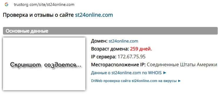Проверка интернет-ресурса аферистов ST24Online на trustorg com показала, что возраст домена к моменту написания статьи составляет 259 дней, вероятно домен купленный.