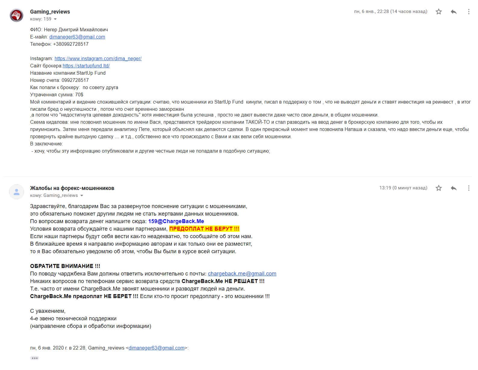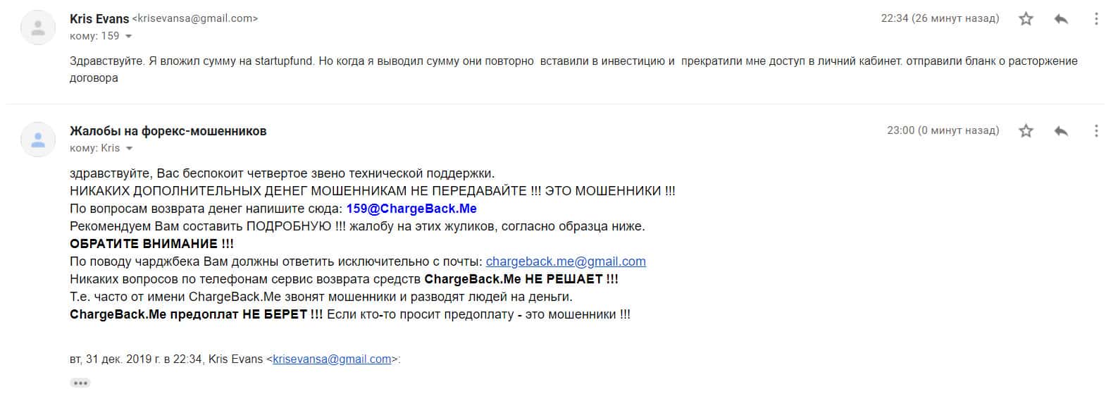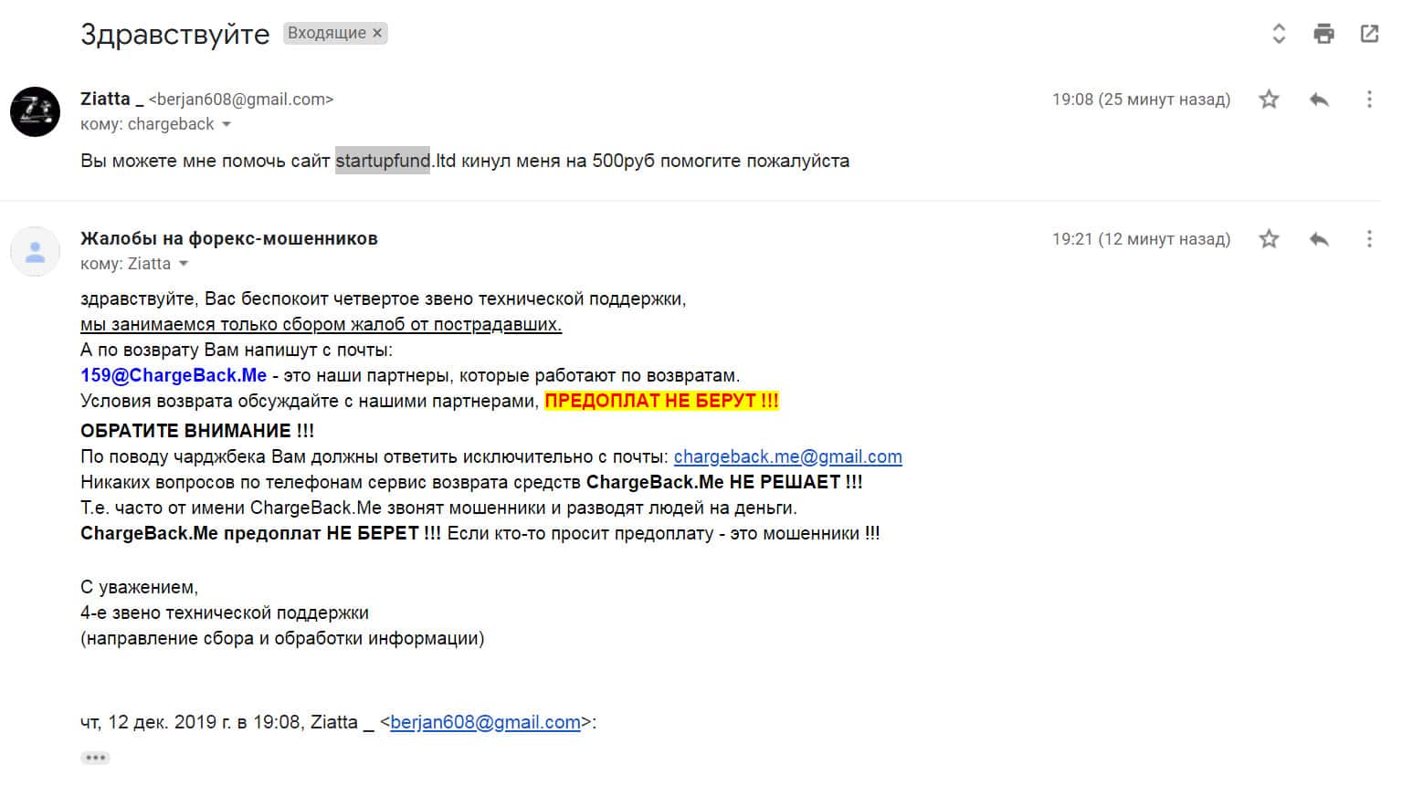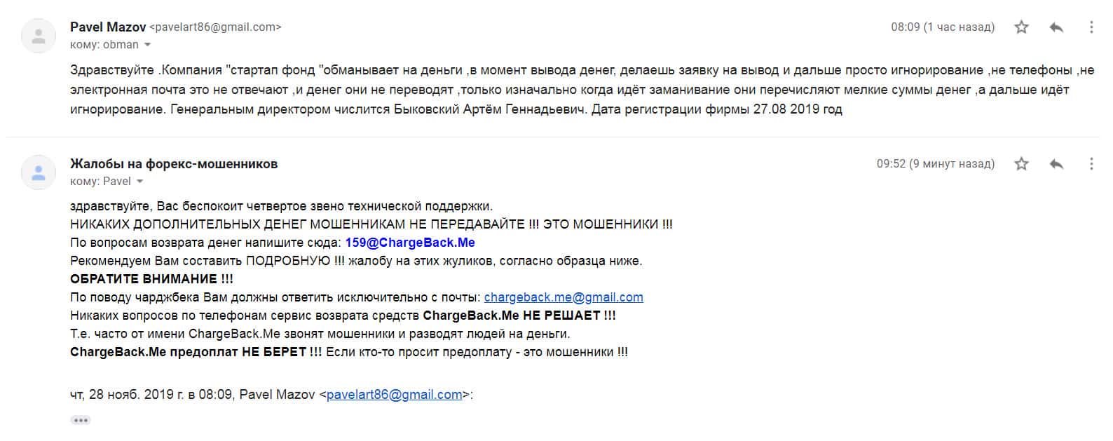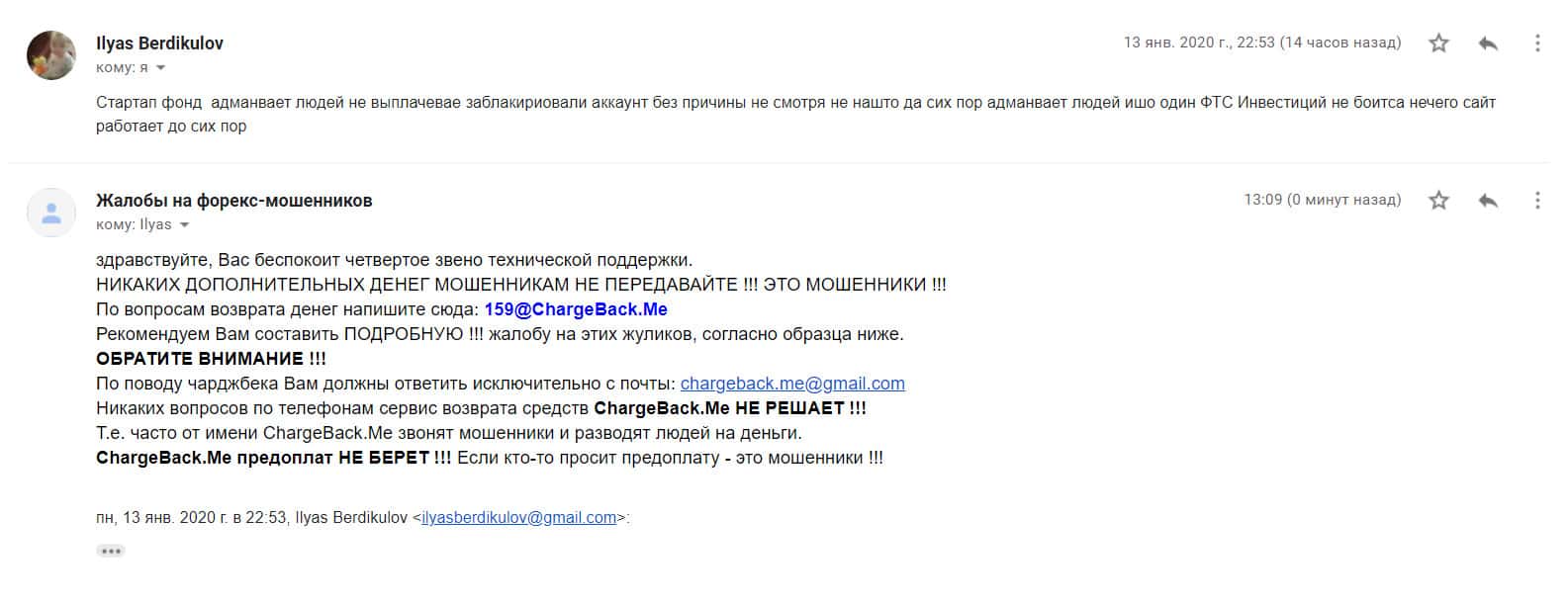 Первым таким информационным материалом, который был написан одним из пострадавших клиентов СтартапФонд является подробная жалоба на данную мошенническую компанию. В письме упоминают такие имена жуликов-сотрудников лохотрона как Петр, Василий и Наталия.
