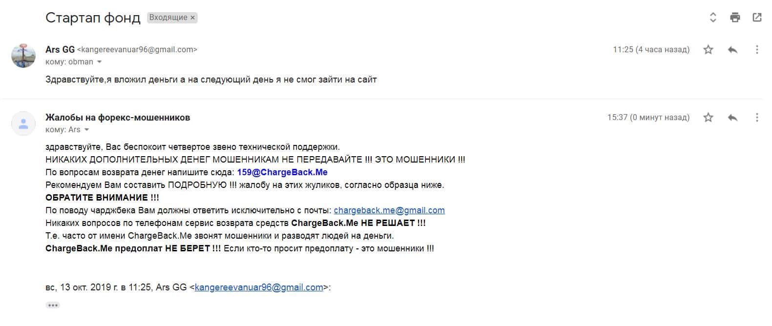 Очередной обманутый клиент хайп-проекта Star Tup Fund писал ранее на электронную почту веб-сервиса по сбору жалоб на разных онлайн-мошенников. На публикации ниже Вы имеете возможность ознакомится письмом, где он сообщает о том, что переводил аферистам деньги.