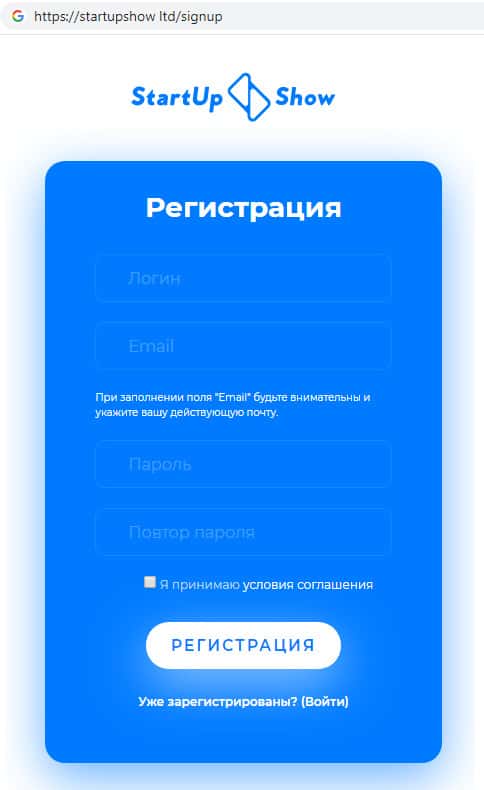 Для того, чтобы зарегистрироваться на сайте мошенников StarTupShow Ltd необходимо назвать логин, адрес электронной почты и пароль, и конечно же подтвердить то, что Вы соглашаетесь с условиями пользования сайтом. Ведь связавшись с жуликами Стар Тап Шоу Вы рискуете потерять все свои деньги и возможно быть по уши в долгах, набравшись кредитов.