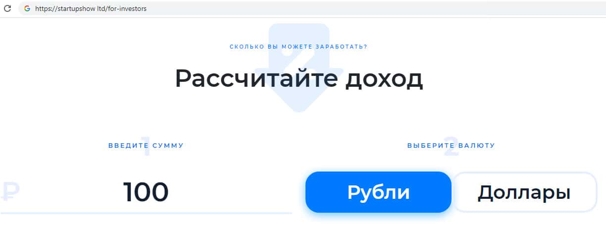 Жулики StarTupShow Ltd предлагают пользователю на их официальном сайте рассчитать курс валют, что является первым признаком очередной финансовой пирамиды. Важно помнить, что подобного типа калькуляторы для подсчета прибыли, либо же курса валют обычно располагаются на сайтах подобных мошеннических организаций.