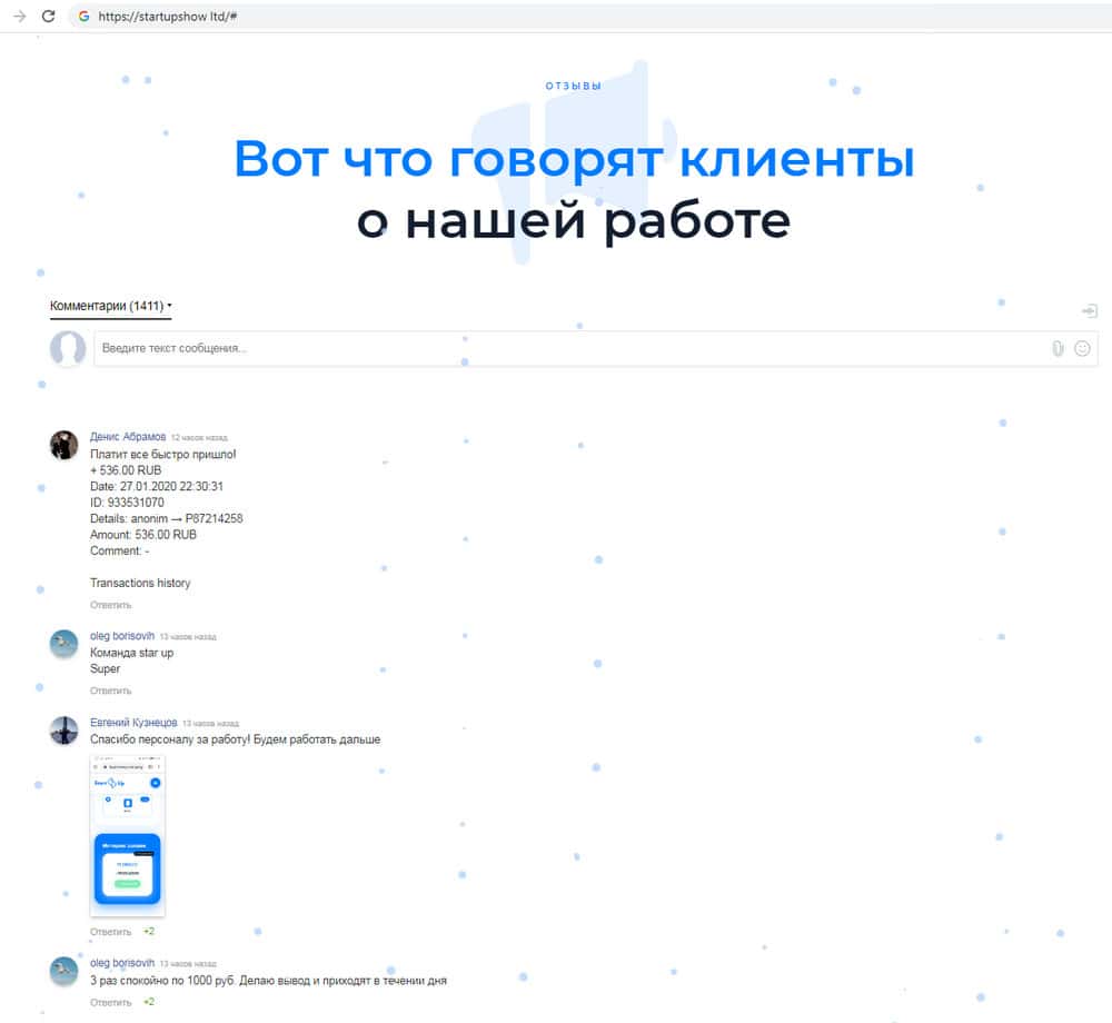 На официальном сайте жульнической конторы StarTupShow Ltd были отысканы отзывы о скам-компании. Шуллера создают видимость, что их контору люди расхваливают, а так же то, что их организация делает выплаты людям. Якобы пользователи делают скриншоты произведенных выплат и сами выкладывают на их дырявый сайт.