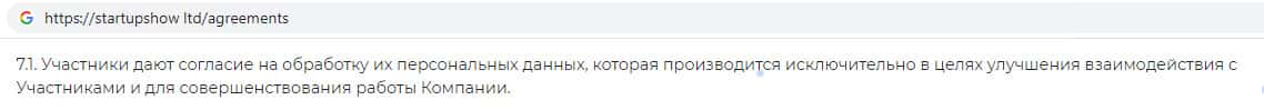 Подписав пользовательское соглашение предоставленное конторой StarTupShow Ltd клиент дает согласие на обработку персональных данных, а именно на то, что использование, передачу, удаление, уничтожение и распространение своих персональных данных. Внимательно читайте условия компании Стар Тап Шоу, прежде чем с ними связываться !!!