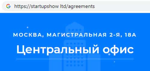 Согласно контактной информации, которую указывает о себе мошенническая организация StarTupShow Ltd зарегистрирована в России, городе Москва. Где ныне базируется огромное количество аналогичных компаний.