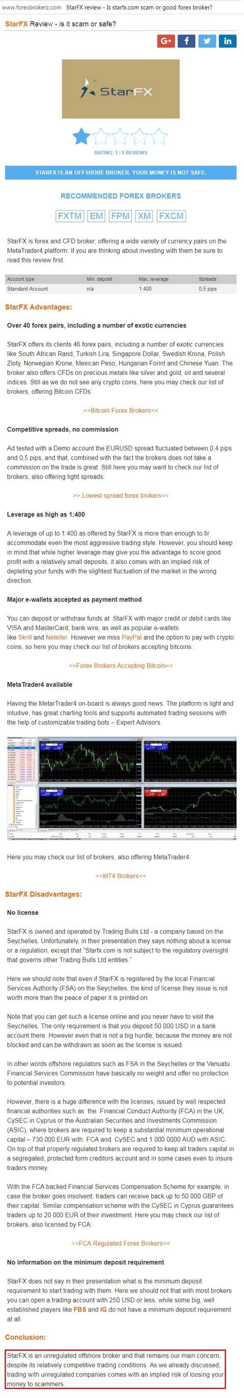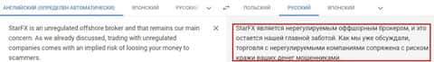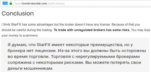 Кроме отзывов русскоговорящих пользователей, в Сети также присутствует немалое количество статей о СтарФХ на англоязычных сайтах. Мы приведём самую качественную из них. В ней закрывается вопрос на счёт регуляции. В прошлом разделе мы видели, что StarFX используют чужую лицензию, которой, мало того, нет на самом сайте. Англоязычная же статья говорит о том, что СтарФХ вообще ни у какого официального регулятора не зарегистрирована.