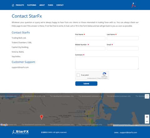 Контактная информация, с помощью которой можно связаться с форекс-лохотроном СтарФХ, представлена на сайте конторы, правда в жатом формате. Здесь мы можем только встретить форму для обратной связи, адрес конторы, которая кстати зарегистрирована как Trading Bulls Ltd, а также почту. Ниже представлены все эти данные: