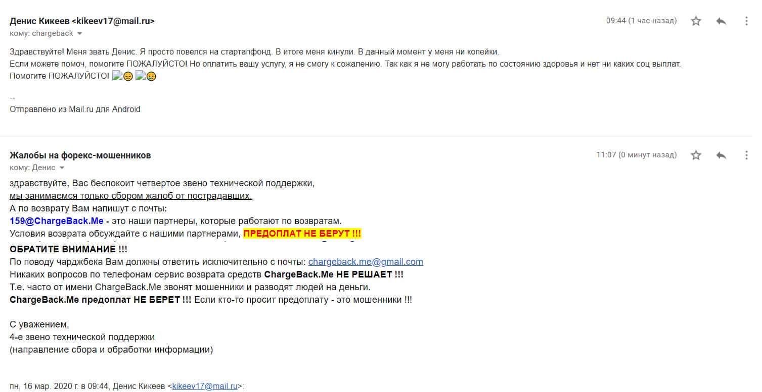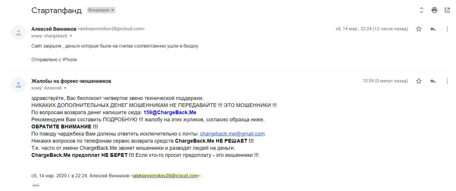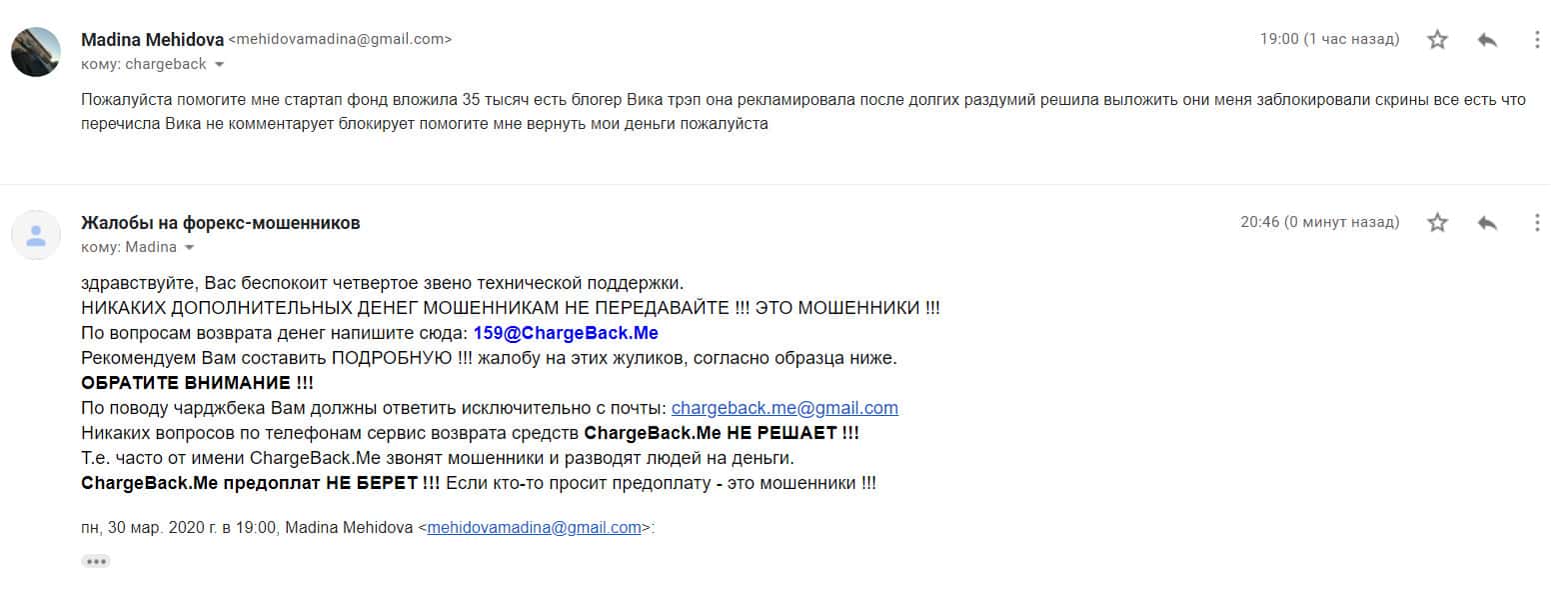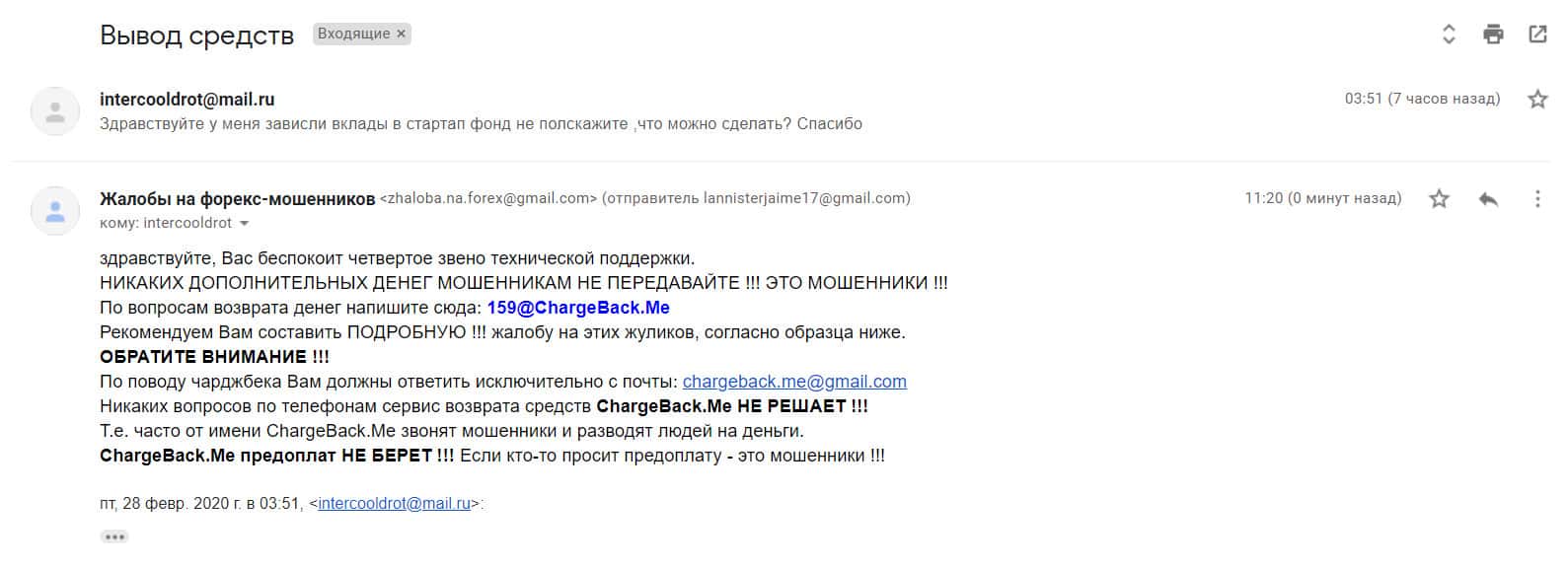 В следующем письме рассказывается, как контора StarTupFund обворовала человека на сумму в 250 000 рублей. Аферисты открыли несколько сделок по его счету и слили немного. Когда он создал запрос на вывод средств, мошенники сразу же перестали выходить на связь. Теперь он ищет варианты, как быстрее все это разрешить.