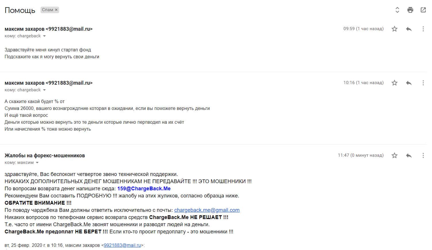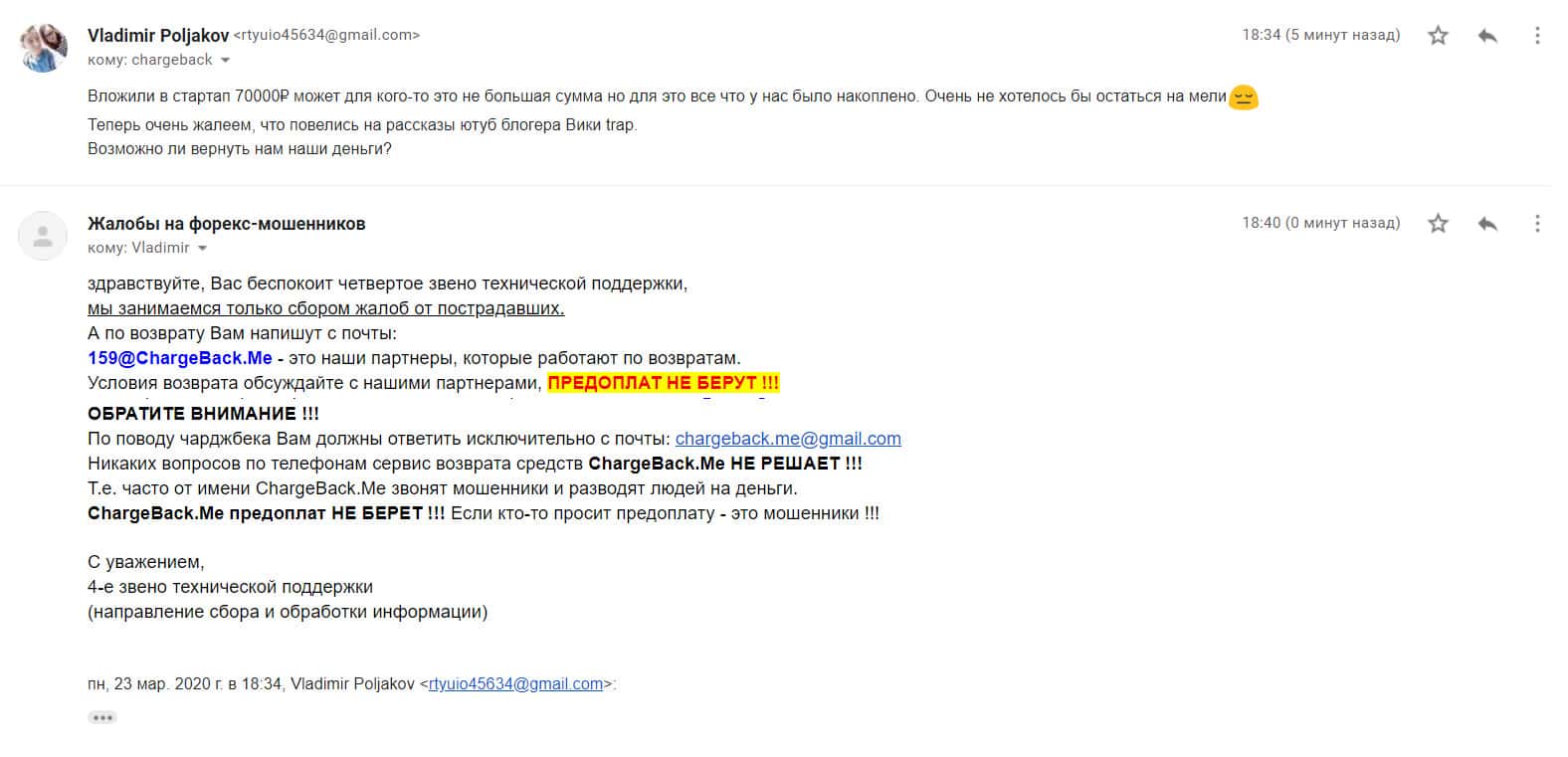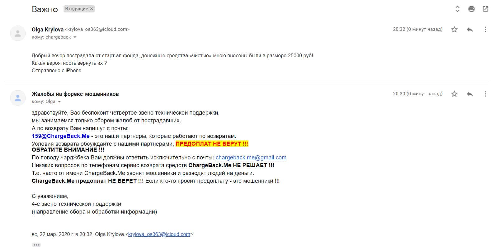 В следующем письме рассказывается, как контора StarTupFund обворовала человека на сумму в 250 000 рублей. Аферисты открыли несколько сделок по его счету и слили немного. Когда он создал запрос на вывод средств, мошенники сразу же перестали выходить на связь. Теперь он ищет варианты, как быстрее все это разрешить.