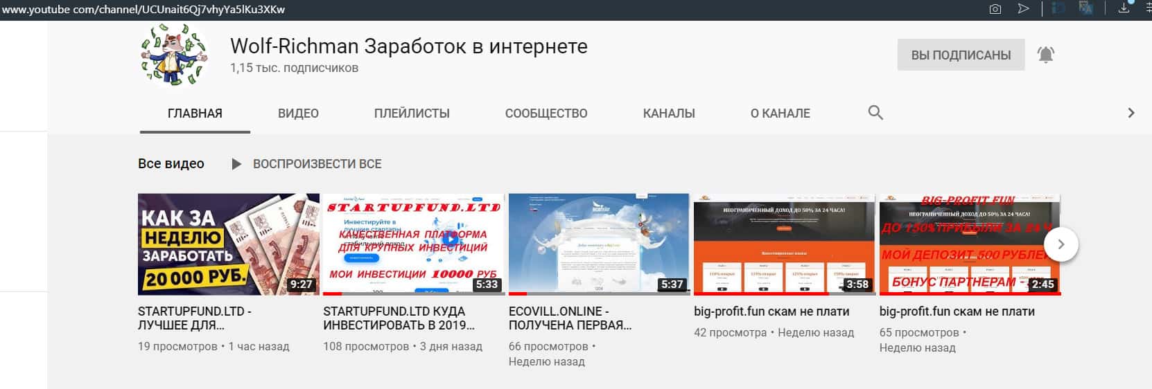 - Лоховод Артур со своим каналом "Wolf-Richman Заработок в интернете" также ищет очередного лоха, рекламируя скам StarTupFund;