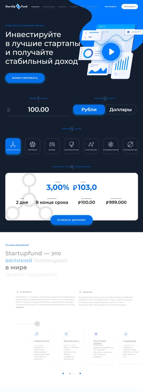 StarTupFund - лохотронский хайп, который позиционирует себя как сервис по анализу и отбору самых прибыльных стартапов в рунете. Имеет еще один свой сайт-клон под названием СтарТапШоу, где также разводят людей. Таким образом аферисты пытаются войти в доверие к своим клиентам, которые отдадут деньги на их площадку. Но деньги не пойдут дальше конторы Стартап Фонд, которая присвоит их себе.