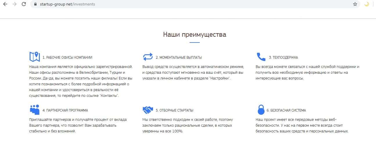 Startup-Group - самый настоящий лохотрон с плохим маркетингом. Компания занимается тем, что призывает людей вкладывать деньги, и затем в короткие сроки получат огромный процент, но на деле оказывается, что забирают ваши вклады, оставляя ни с чем. Не связывайтесь с мошенниками, что бы сохранить деньги.