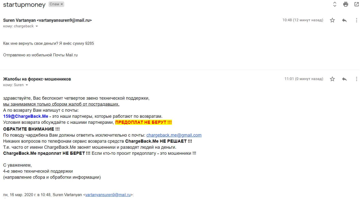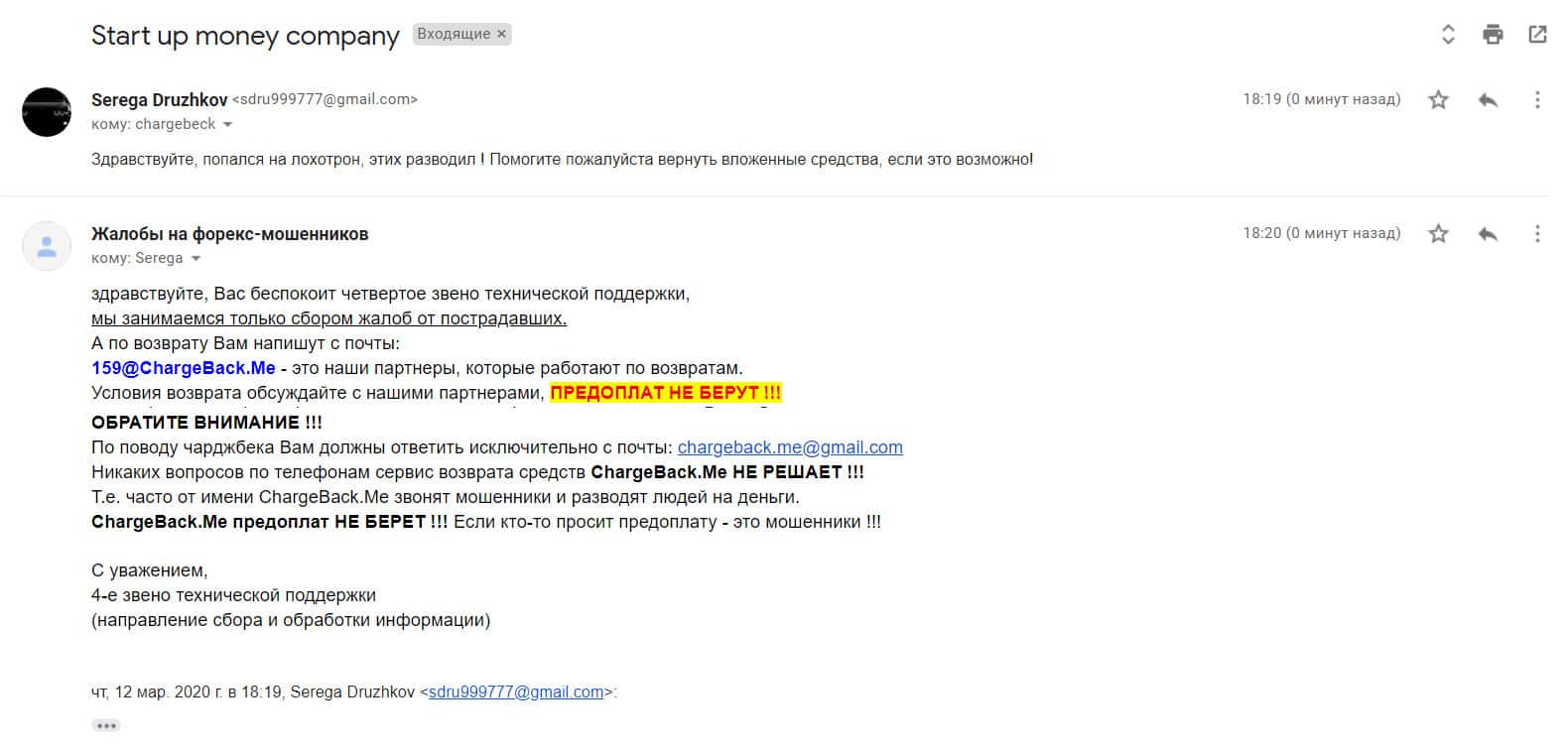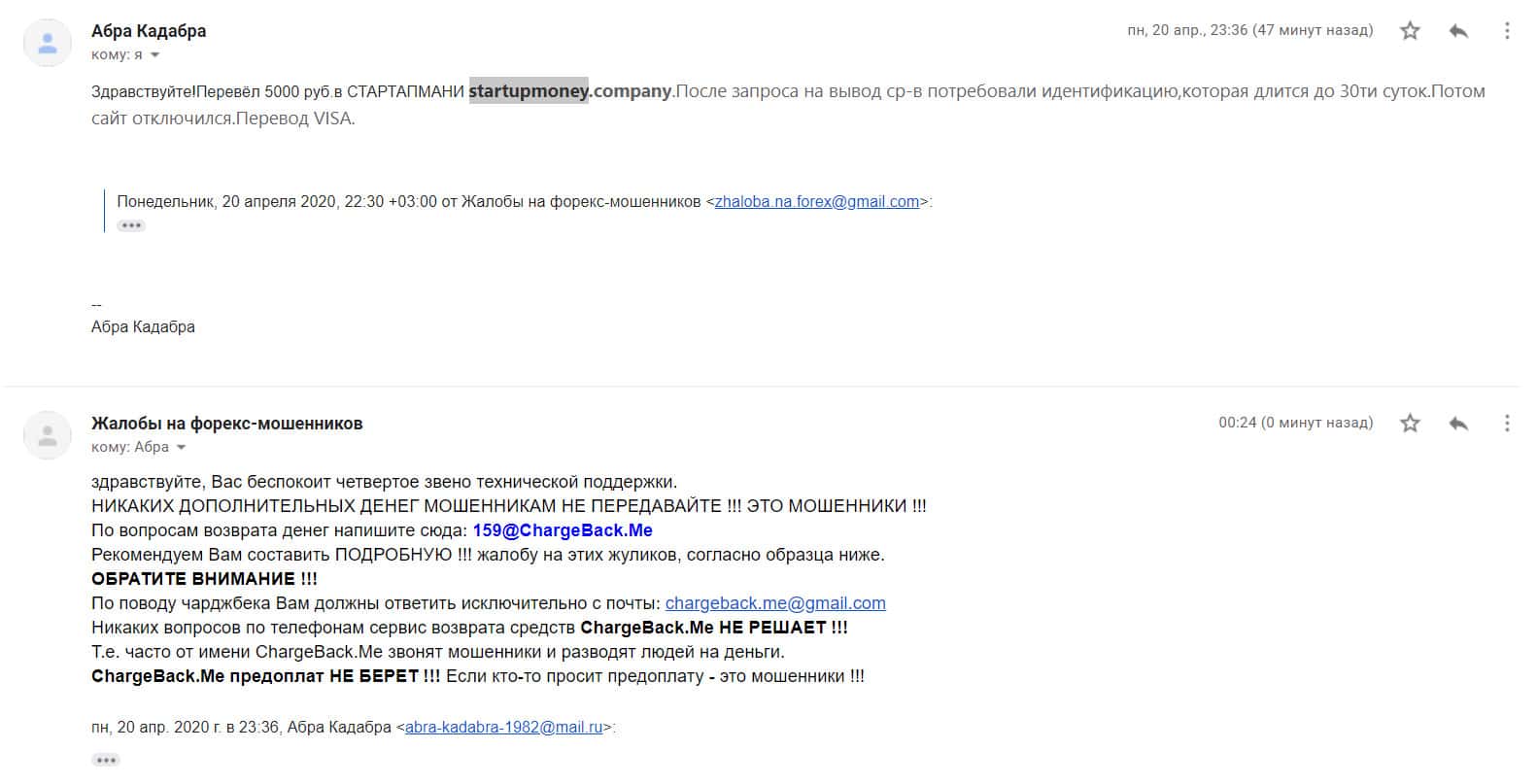 Ниже представлена первоначальная жалоба, в которой клиент конторы StartupMoney Company рассказывает, как его развели там на деньги.