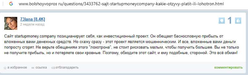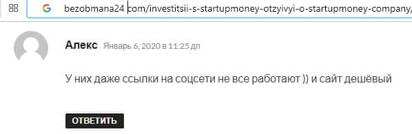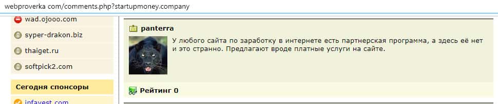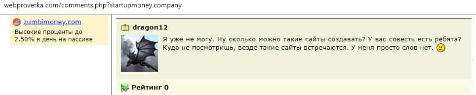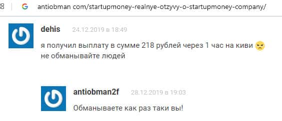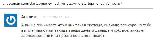 - Один из липовых отзывов, касательно выплат с кухни StartupMoney Company