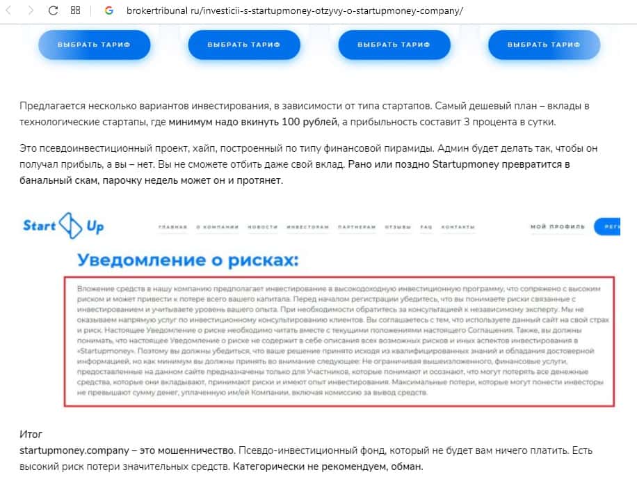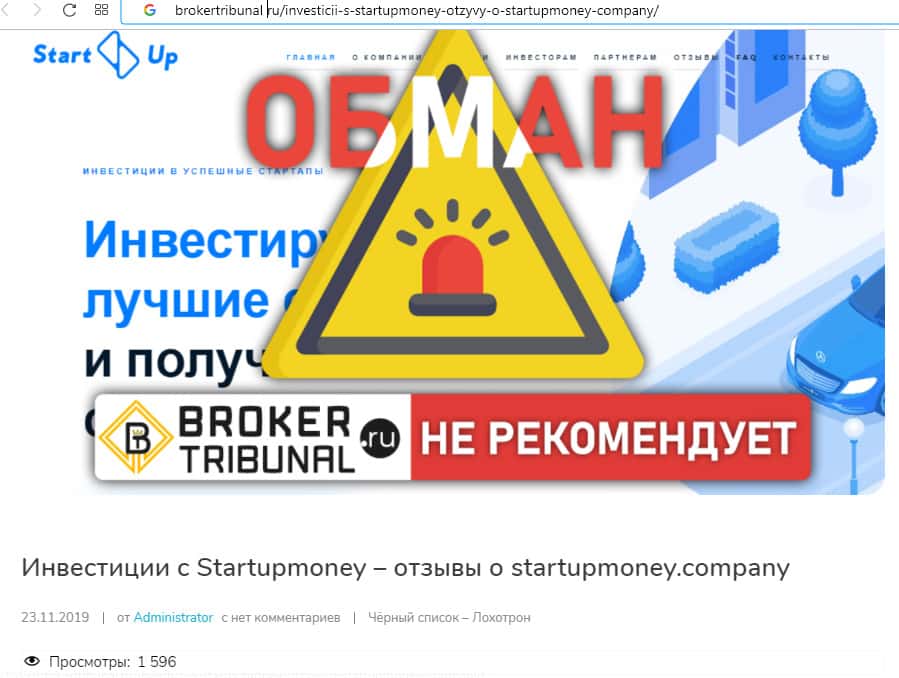 Далее представлена титульная картинка со статьи на сайте brokertribunal ru, где описывается деятельность шарашкиной конторы StartupMoney Company. Инвестиции в данную пирамиду МММ очень опасны, так как нет никакой гарантии, что выплатят проценты, а по сути и вообще могут не вернуть вложения.
