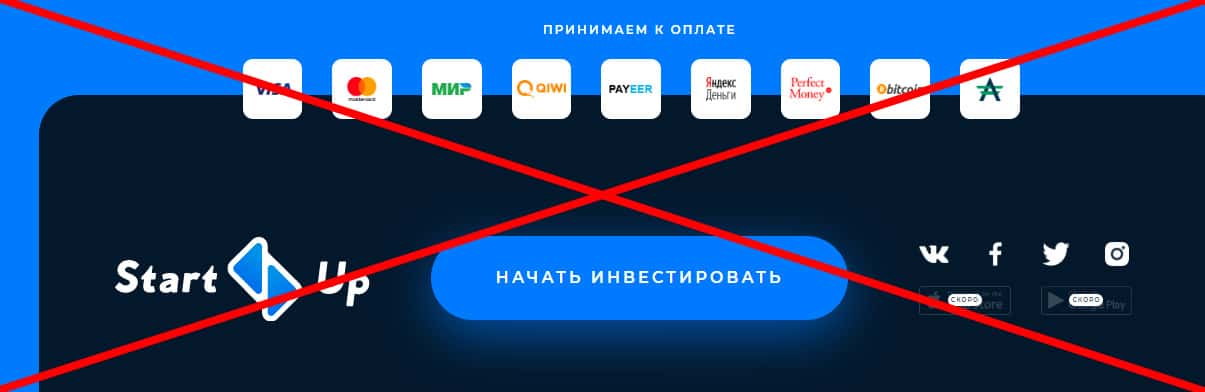 А вот касательно остальных социальных сетях, которые размещены кнопками на сайте кухни Стартап Мани, следует отметить, что они не работают. Жулье просто оставило пустые ссылки и это касается даже приложений на телефон, типа они должны скоро стать активными. Но это "скоро" никогда не наступит.